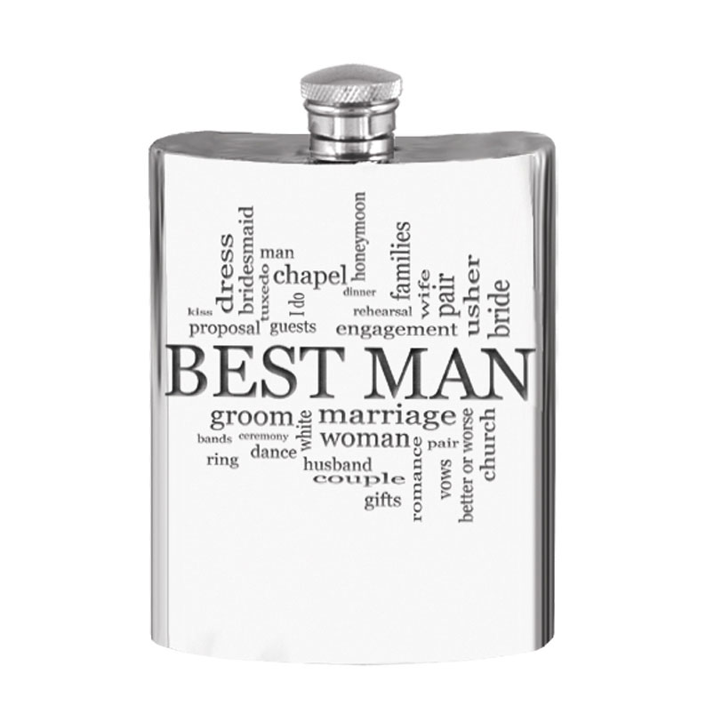 Flasque en étain référence WD526, de style moderne et décorée de textes anglais évocateurs comme Best Man, Marriage, Couple, Husband ou encore Engagement...